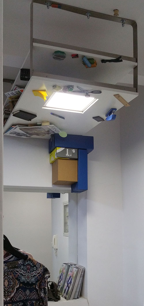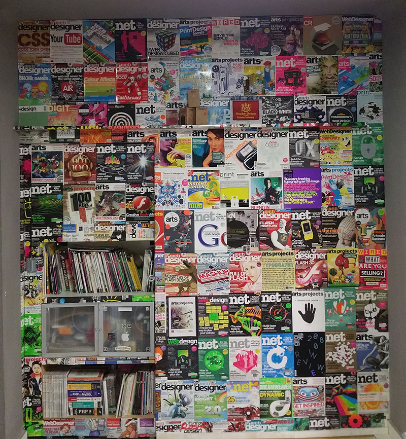 Office divider wall. Wood, IT & design magazine covers and three old IKEA cabinets in their new repurpose role as sliding door.